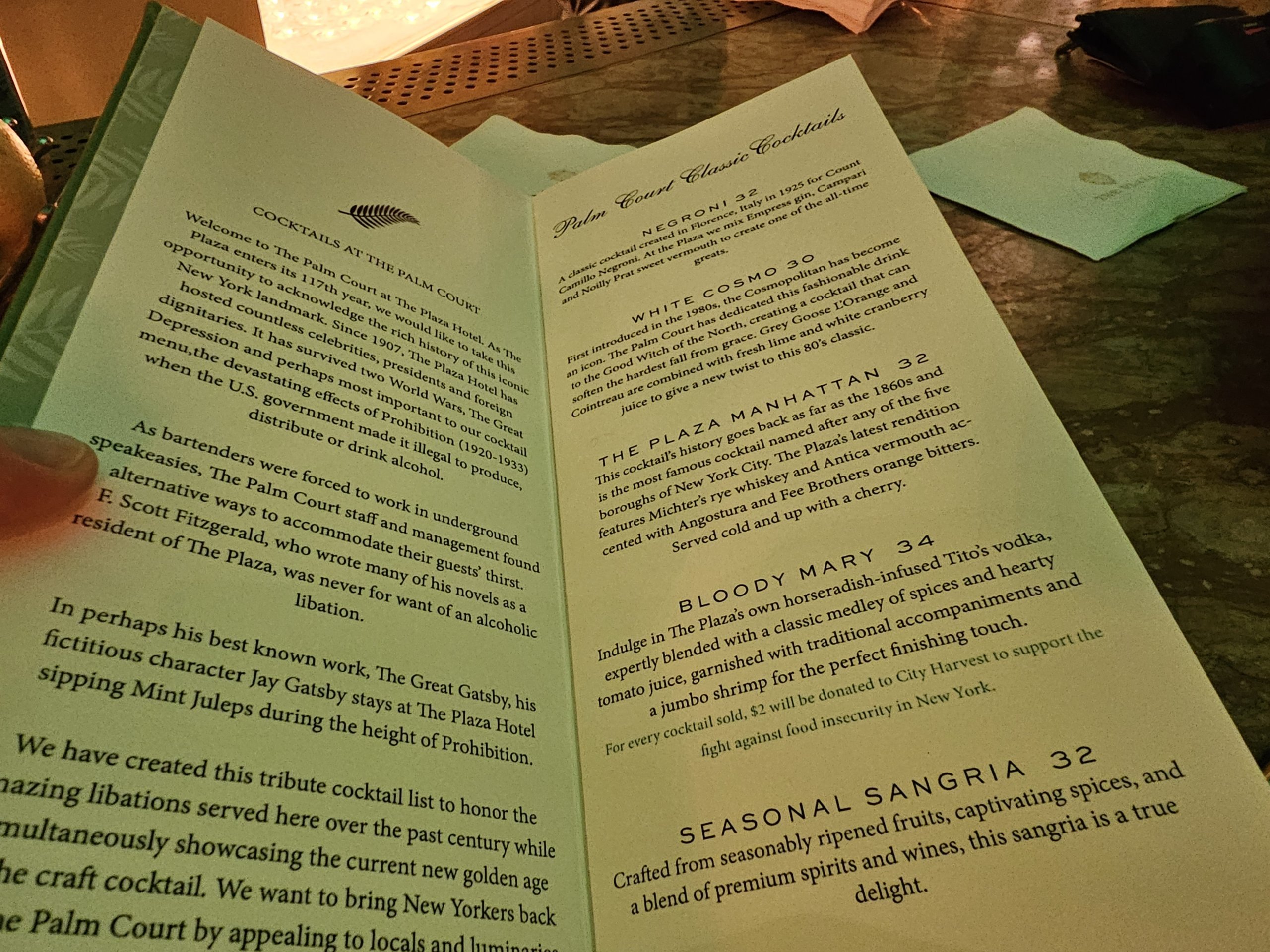 Den andra kvällen går vi till restaurangen Palm Court för två drinkar, som är fantastiska.