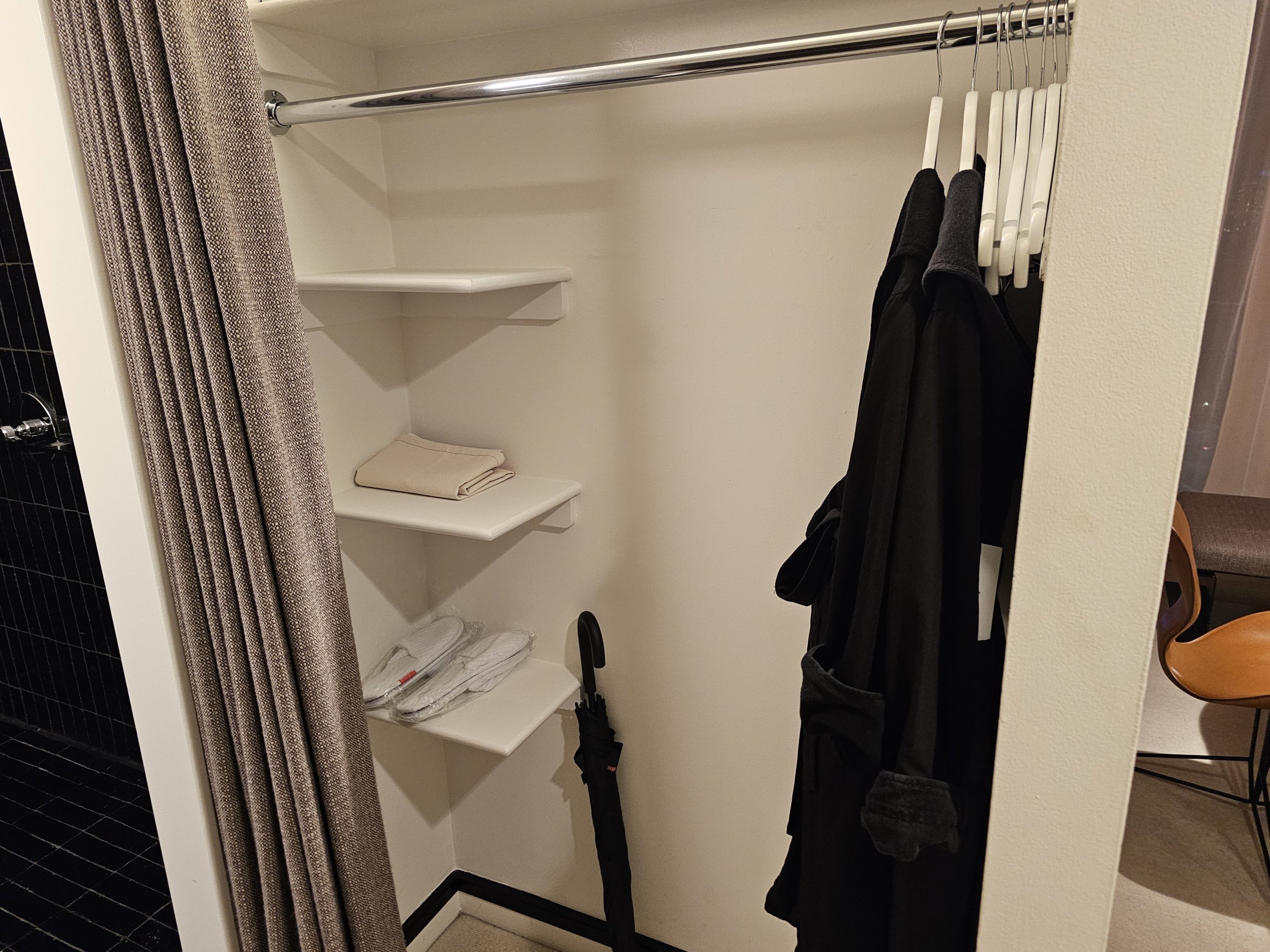 Det finns väldigt lite förvaringsutrymme, praktiskt taget bara ett skrivbord med en soffa och en "garderob" bakom en gardin med flera galgar. I övrigt ingenting.