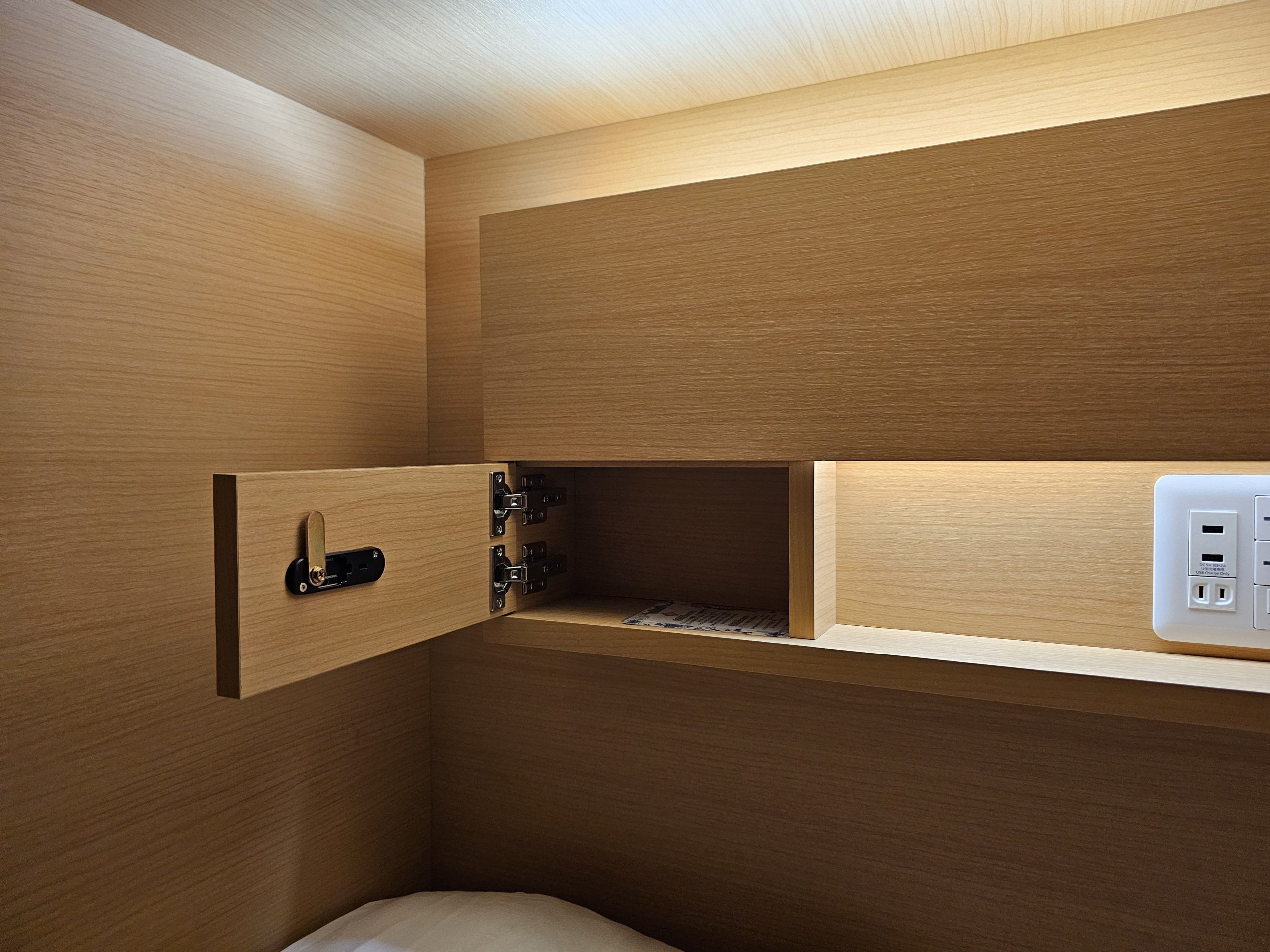 Det finns visserligen inget förvaringsutrymme i kapseln, men eftersom madrassen är relativt bred har jag min ryggsäck och två dricksflaskor precis bredvid mig.