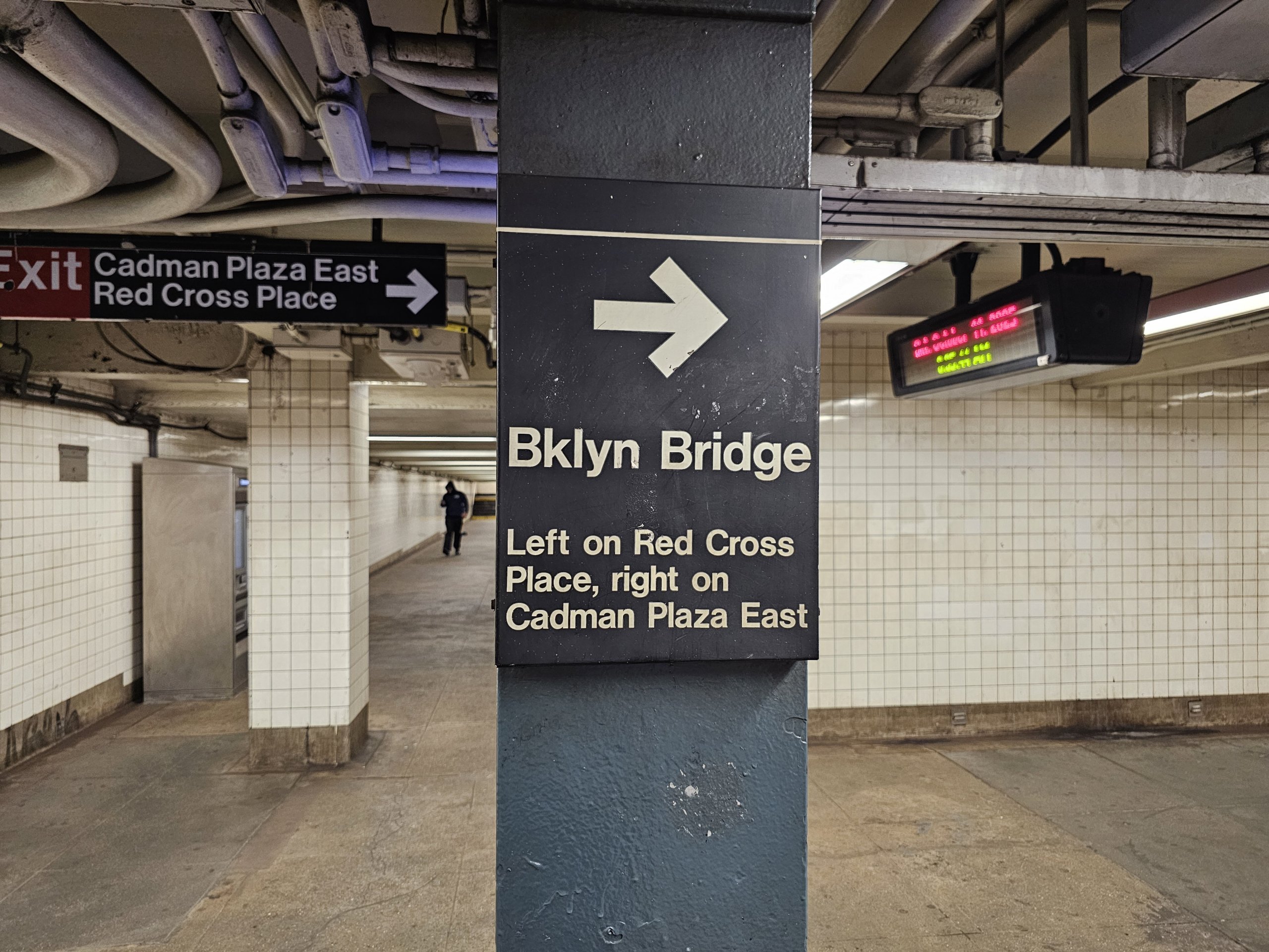 Vi rekommenderar att du använder stationen High Street, som är den närmaste och från vilken det finns direkta skyltar till Brooklyn Bridge.