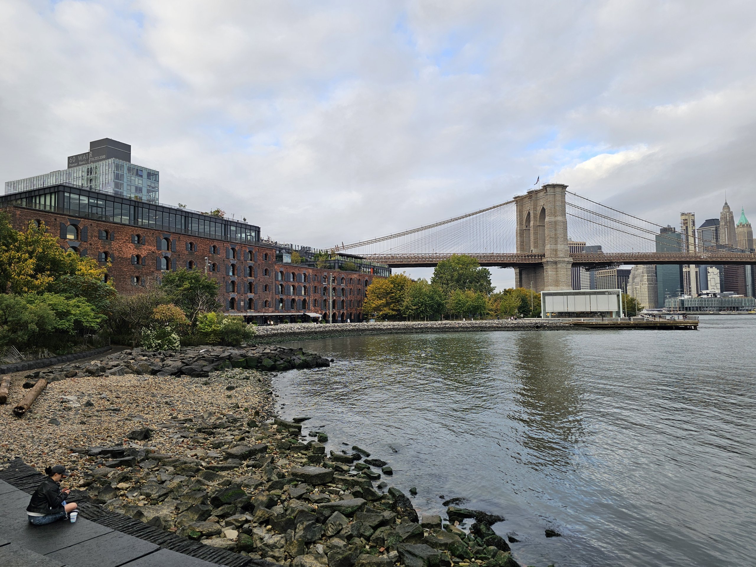Från flodstranden kan du se både Manhattan- och Brooklynbroarna och Manhattans skyline i bakgrunden.