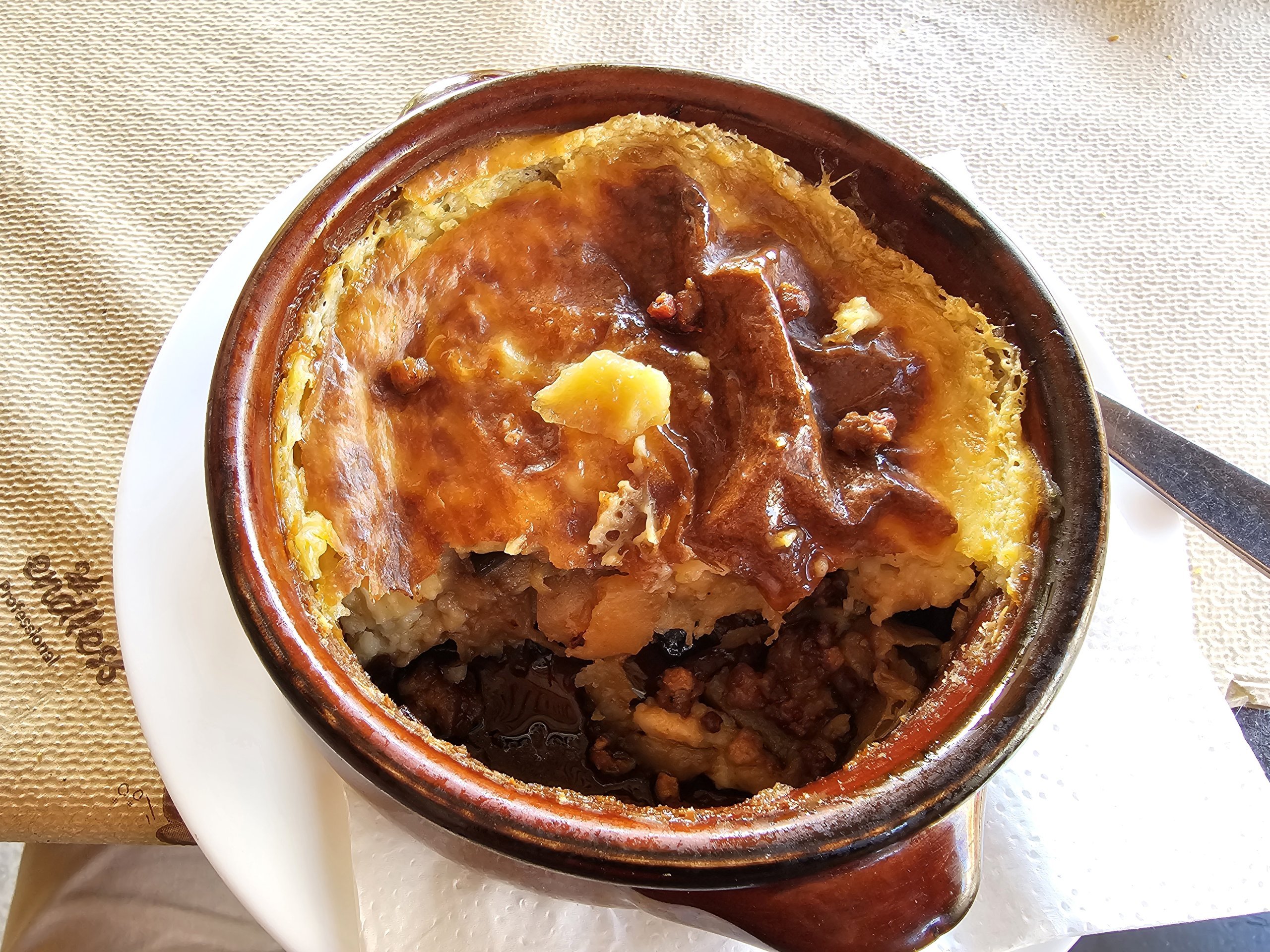 Musaka - en av de mest kända grekiska rätterna, ofta kallad "balkanlasagne". Det är flera lager bakad aubergine (sällan en skål med zucchiniaubergine) varvat med lamm och toppat med en béchamelsås.
