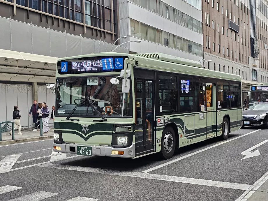 Gräddefärgade bussar med röd rand kör från Kyoto Station till områden som Arashiyama eller vice versa i nordost mot Iwakura och Ohara.