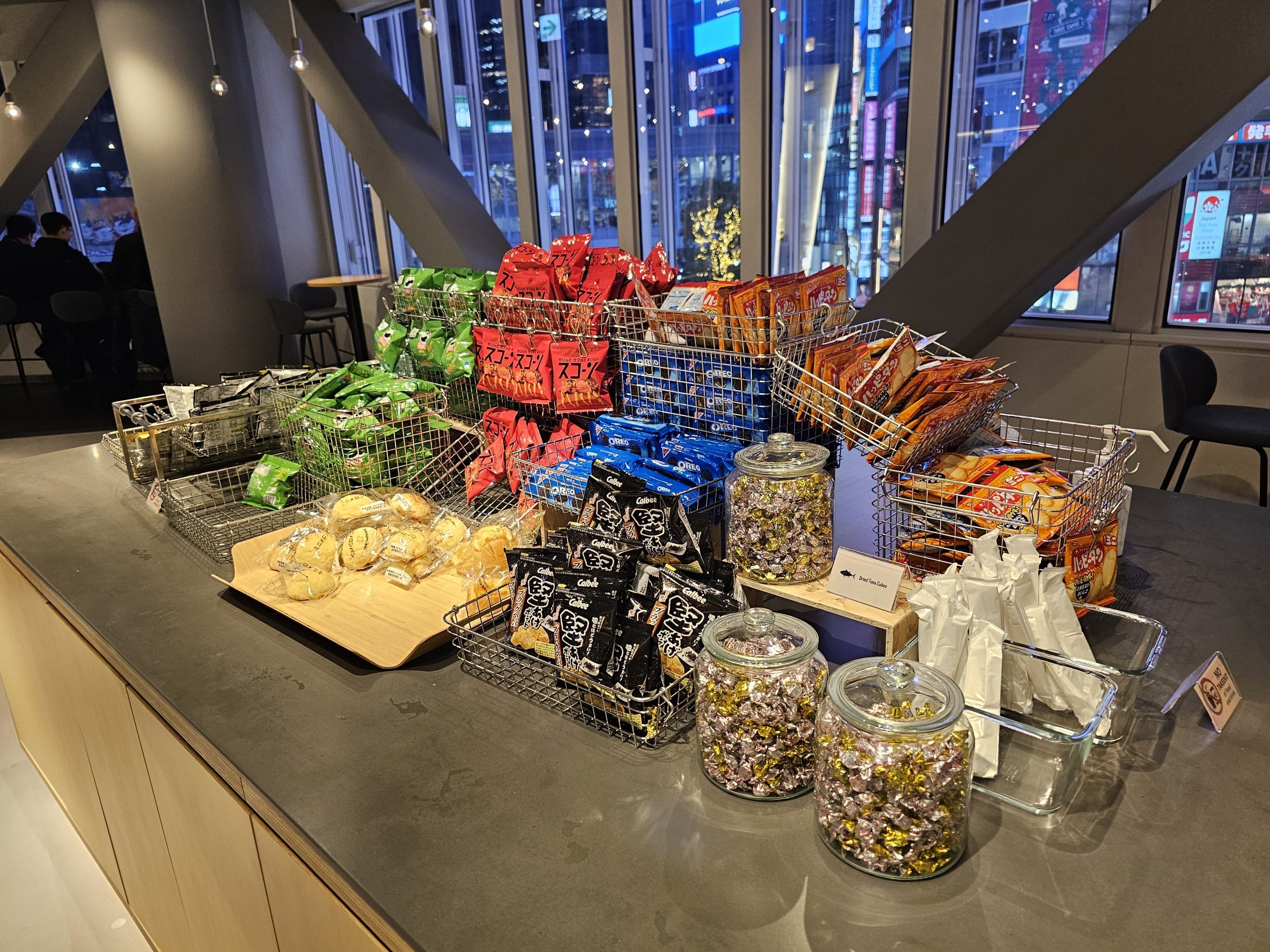 Det här utrymmet är mer som en flygplatslounge. I inträdespriset ingår enkla snacks som kylda drycker, kaffe från automaten eller små sötsaker.