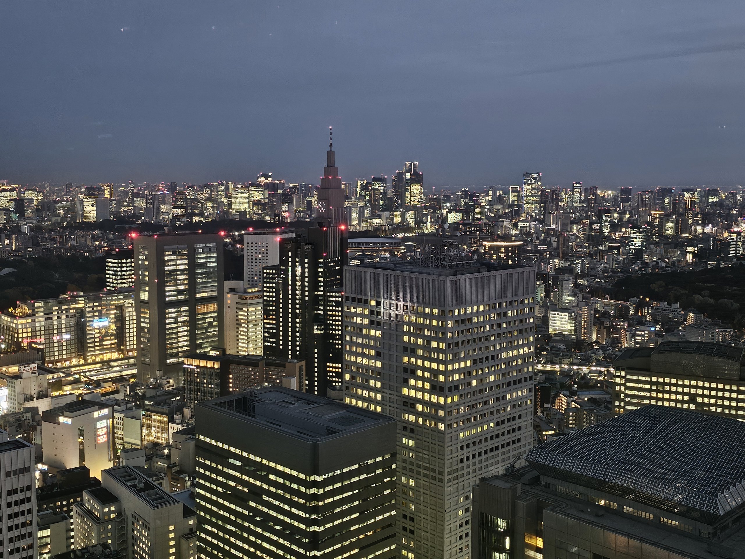 På natten är det starka reflektioner från glaset och utsiktsplatsen är inte lämplig för fotografering i mörker - för en nattutsikt är det bättre att besöka Tokyo Tower och gå uppför utomhustrappan.