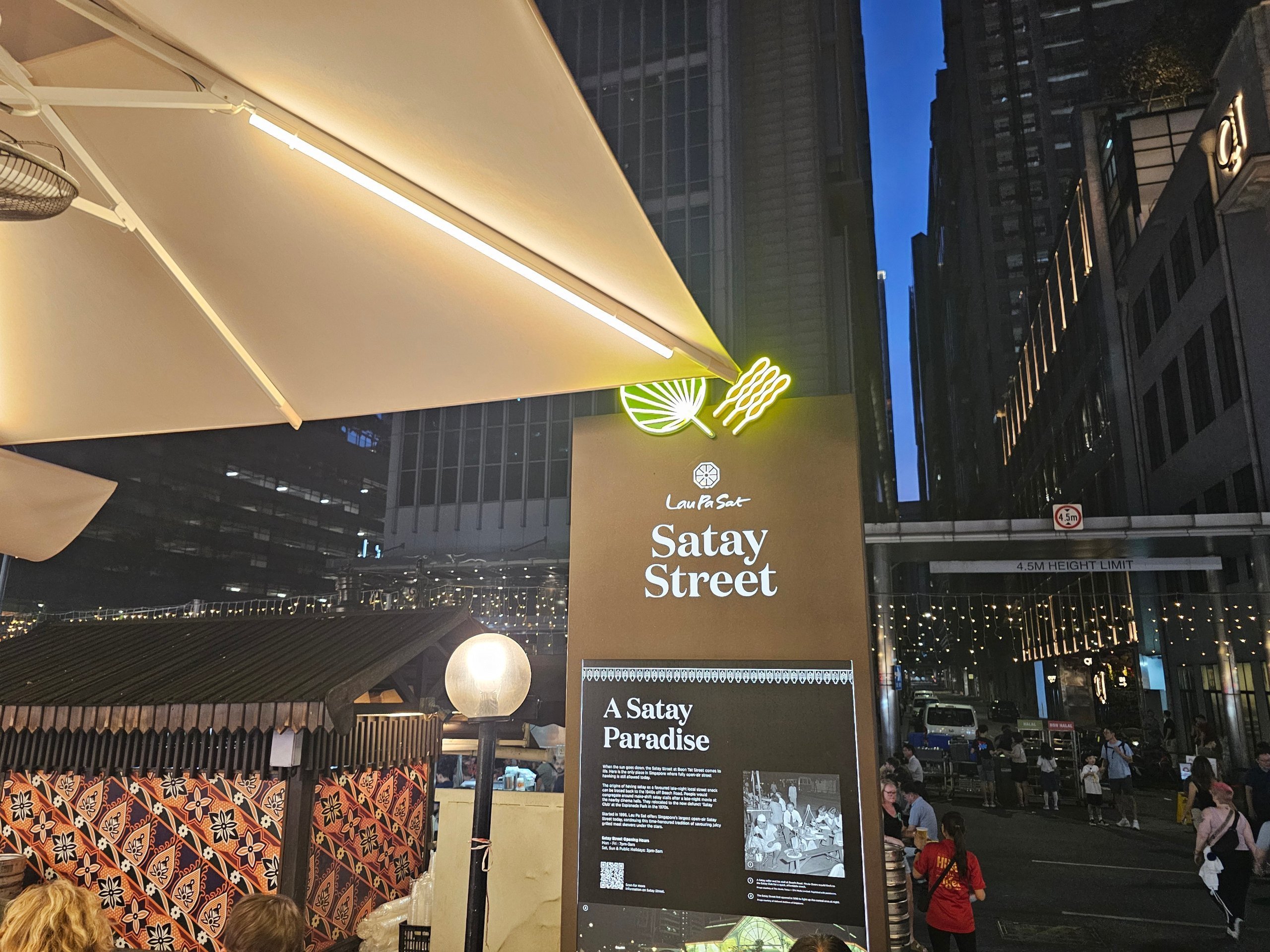 Men på kvällen förändras atmosfären helt - vägen framför byggnaden stängs av och skapar den berömda Satay Street, där dussintals spett grillas och hela platsen liknar en stor utomhusfestival för gatuköksmat.