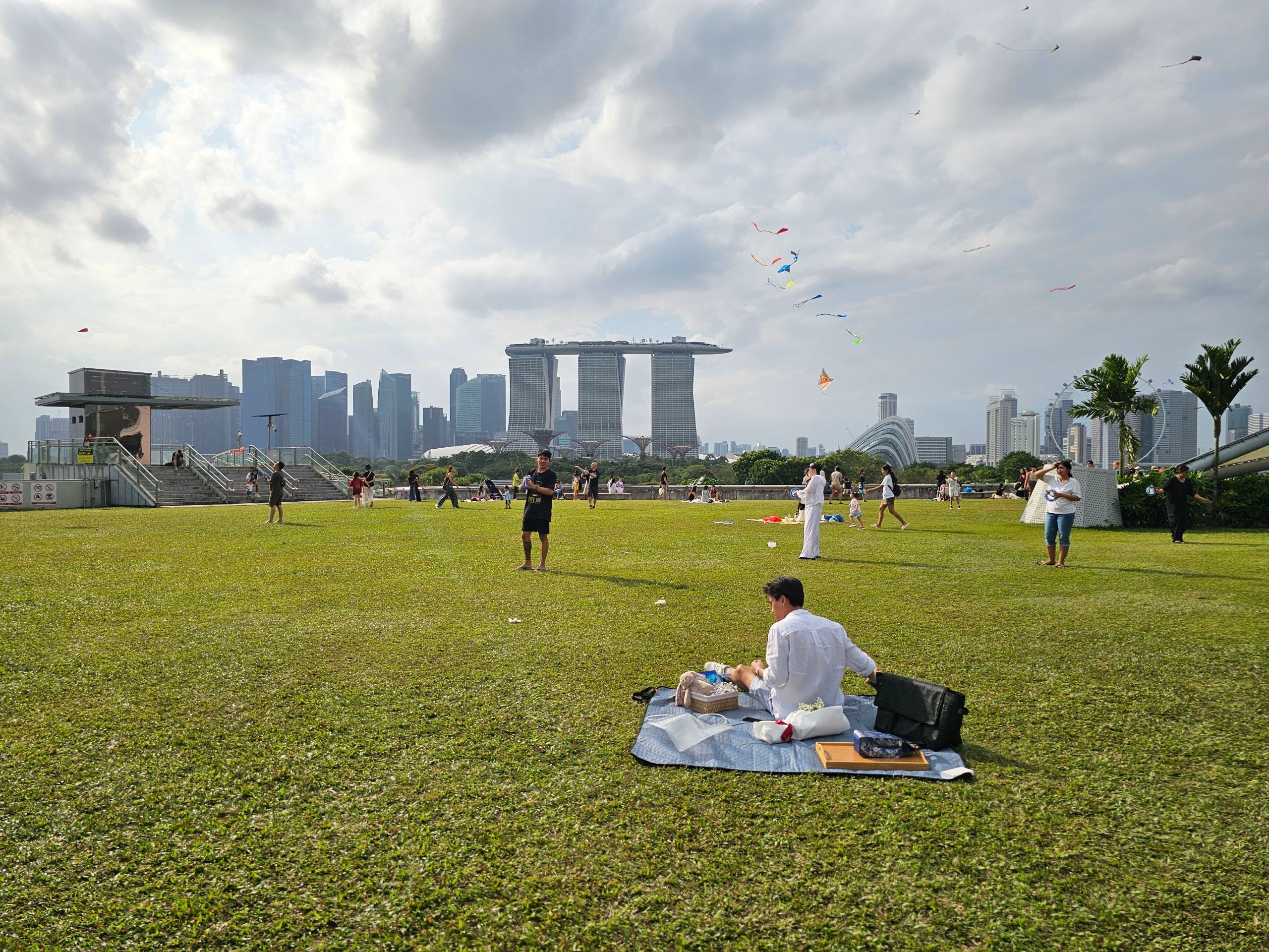 Bara en stor gräsyta på taket av barriären, varifrån man kan se hela Marina Bay-silhuetten - inklusive Marina Bay Sands och Gardens by the Bay.