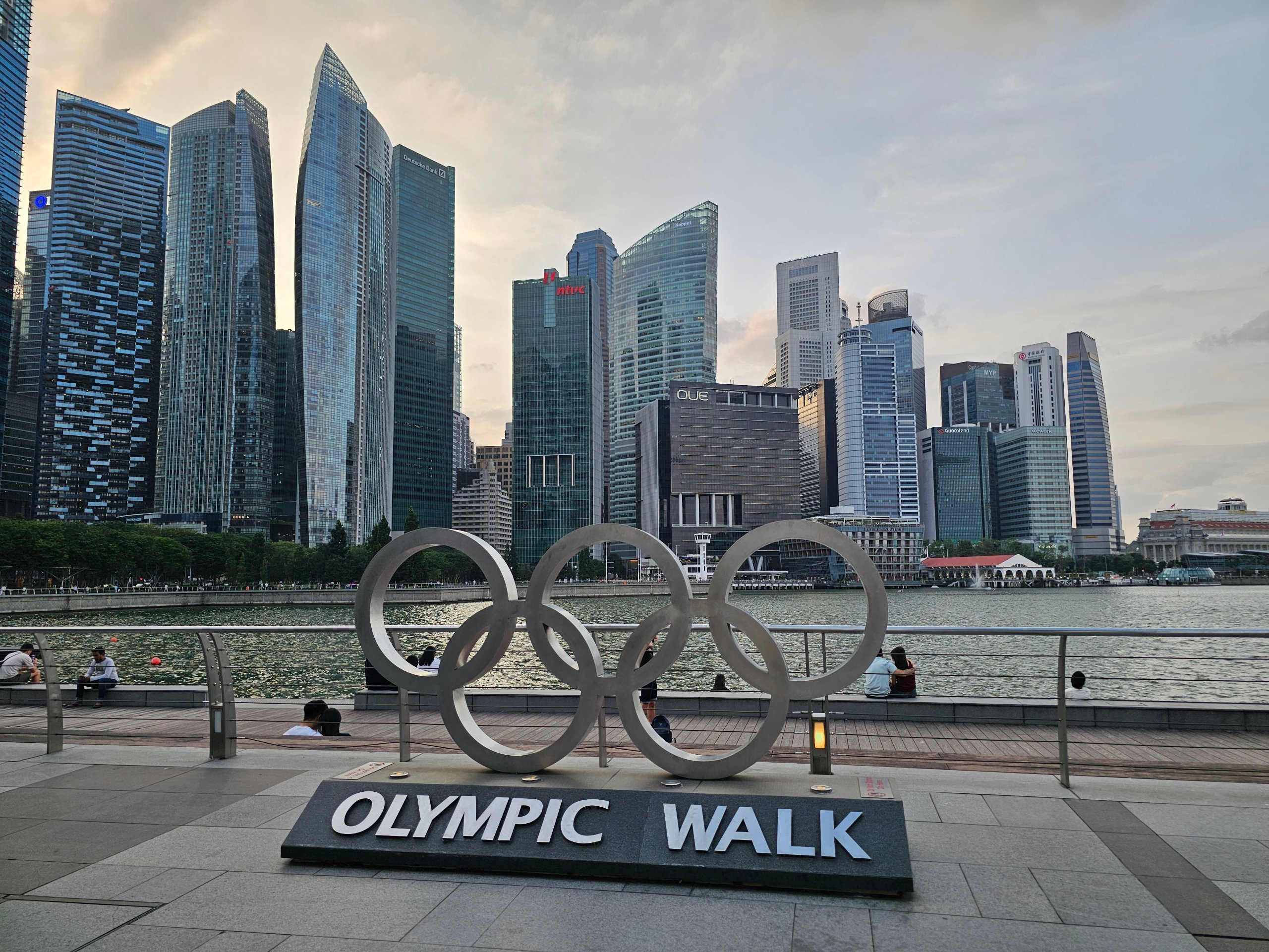 Den breda strandpromenaden med palmer, varav en del kallas Olympic Walk, är en av mina favoritplatser i Singapore.