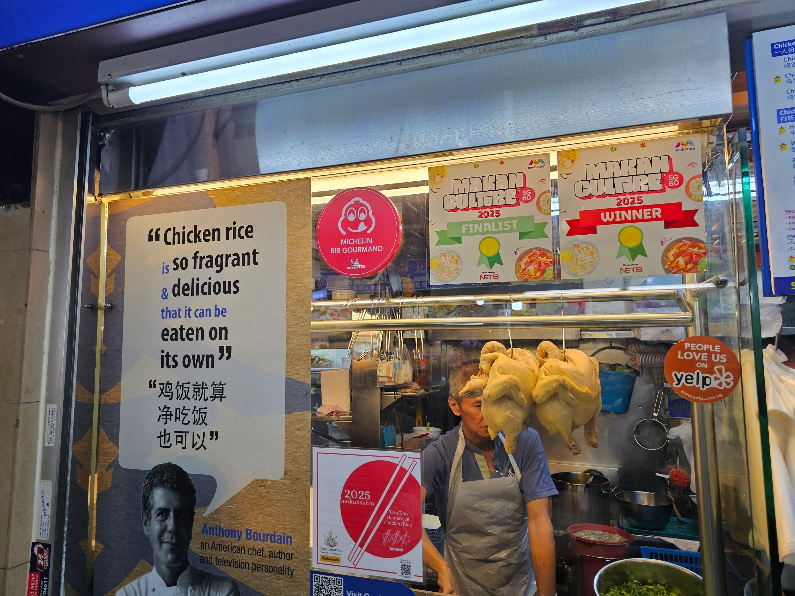 Vissa hawker center-stånd har till exempel en Bib Gourmand-utmärkelse, som Michelin ger för utmärkt mat till ett överkomligt pris.
