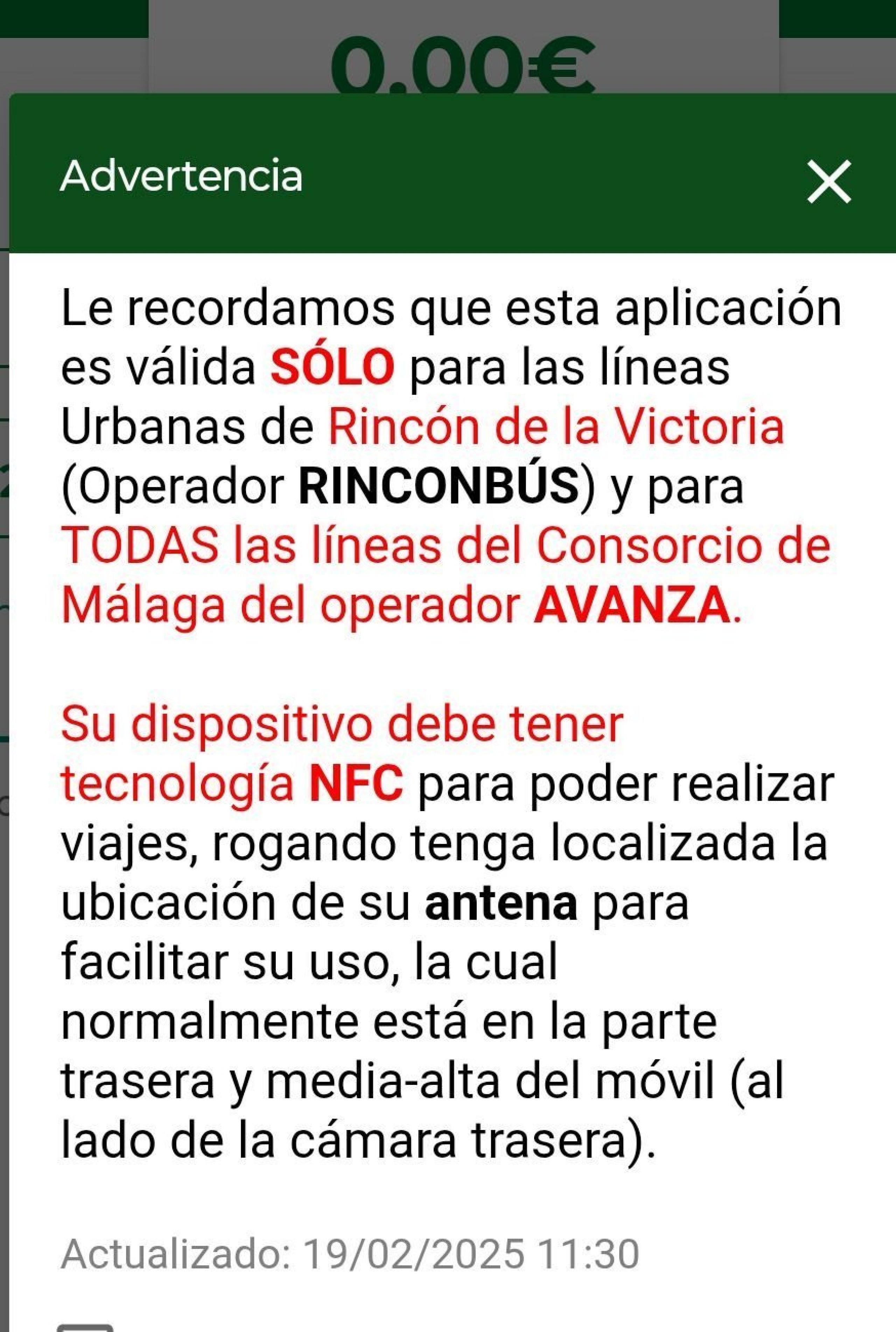 Hej. Jag följde ditt råd. Jag följde ditt råd och det var det största misstaget. Appen för kollektivtrafik i Malaga Consorcio de Transporte Metropolitano är helt värdelös, värdelös och jag spenderade just 5 €. Appen är i pilotfasen och gäller bara för utvalda förortsbussar, inte på något sätt för stadsbussar eller flygplatstjänster. Samtidigt är appen ineffektiv om du ställer in den på engelska, den fungerar bara på spanska på bussen. Sammanfattningsvis är det "jag vill inte ha en gratis rabatt" och helt ohjälpsam, vilseledande och falsk information. Tack så mycket för det.
