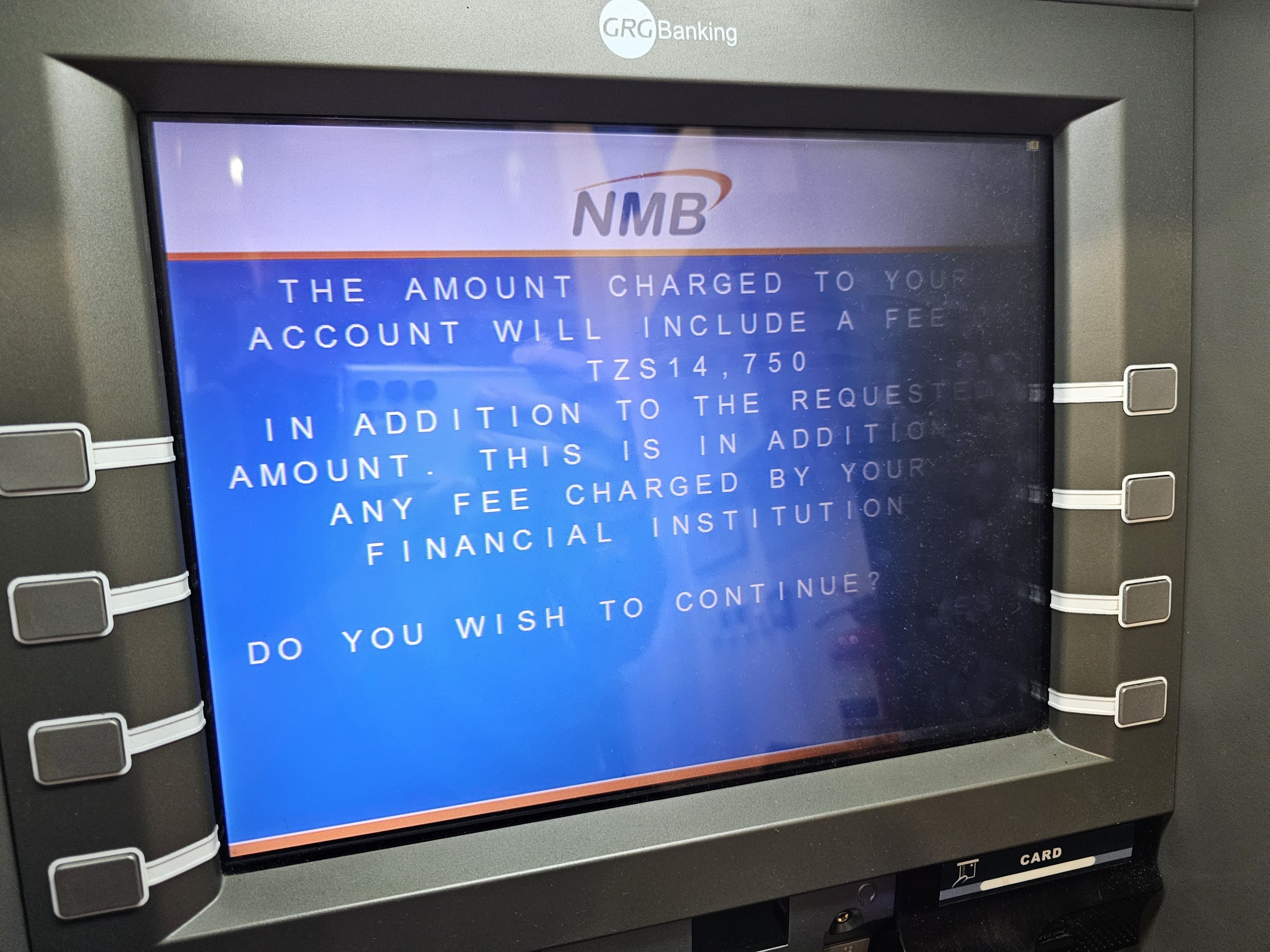 Vanligtvis debiteras uttag med utländska kort med cirka 15 000 tzs. Den lägsta avgiften vi stötte på i en bankomat hos Bank of Zanzibar var 10 000 tzs.