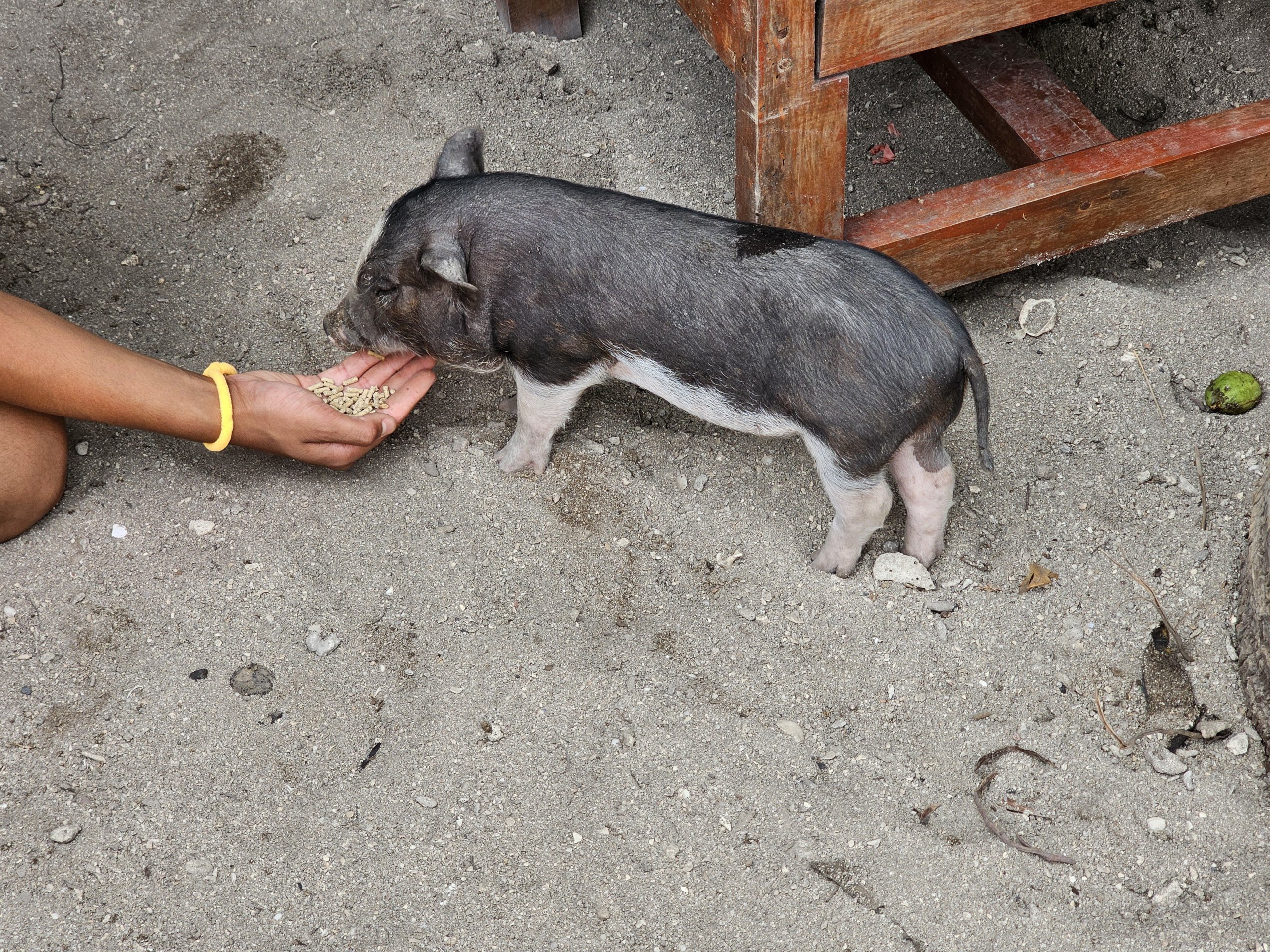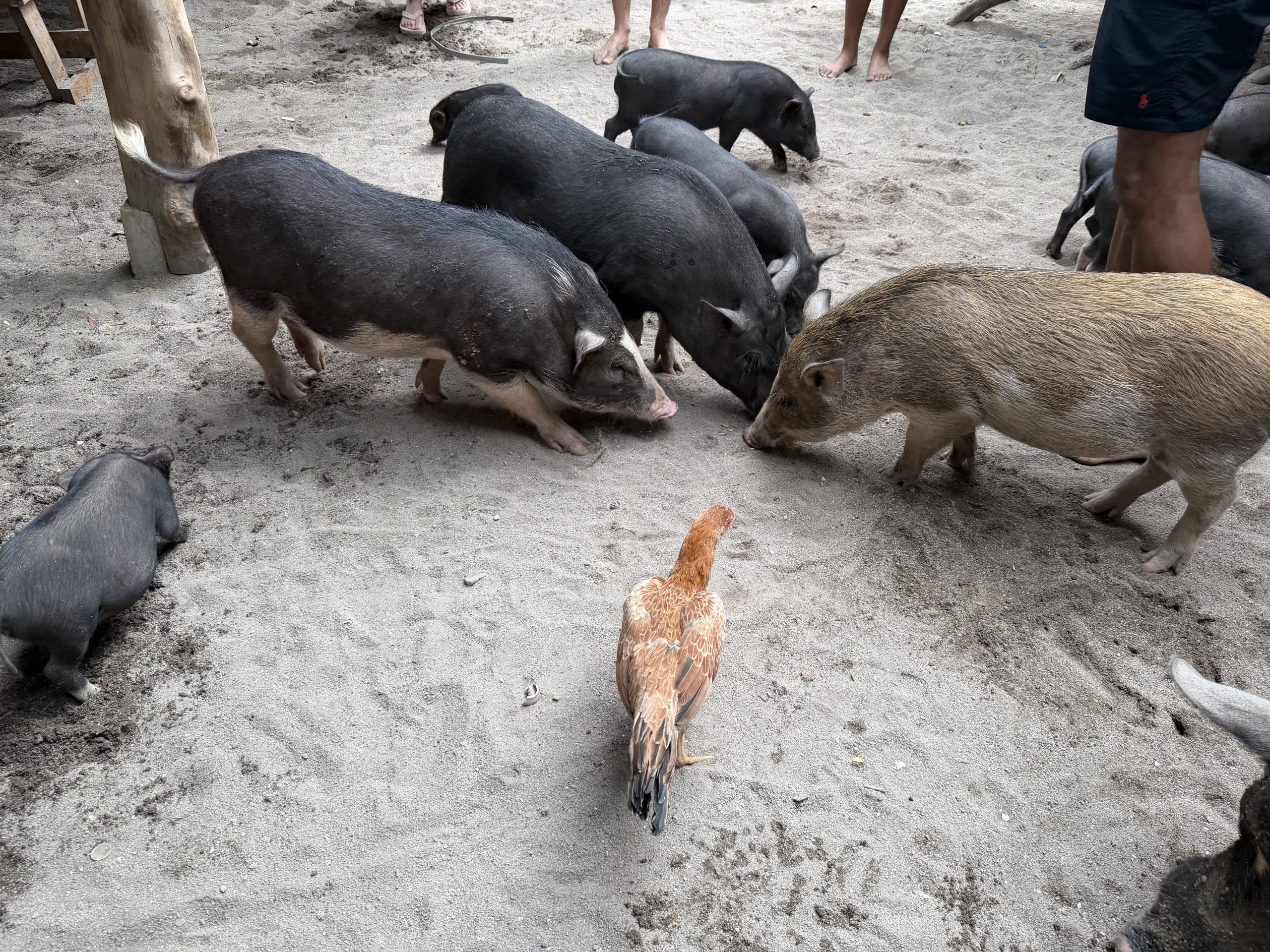 De är inte aggressiva. De springer runt bland turisterna som matar dem med spannmål (det kan man köpa på plats) eller kliar dem på ryggen. Ofta ligger de bara i skuggan eller vadar vid stranden. Turisterna cirklar runt dem med sina telefoner. Det är en lite bisarr scen - ett tropiskt paradis och en sällskapsgris bredvid dig på stranden.